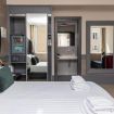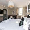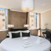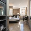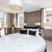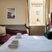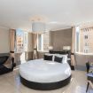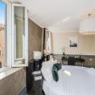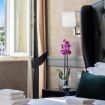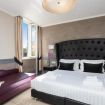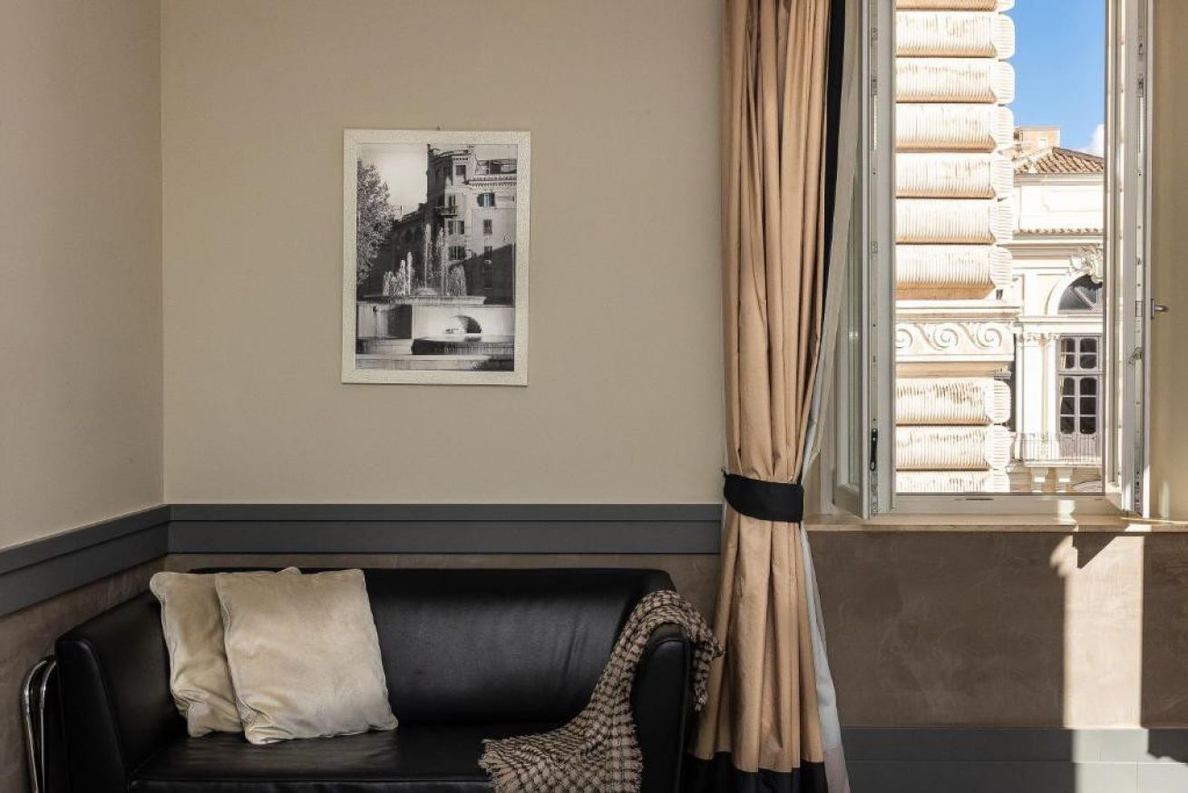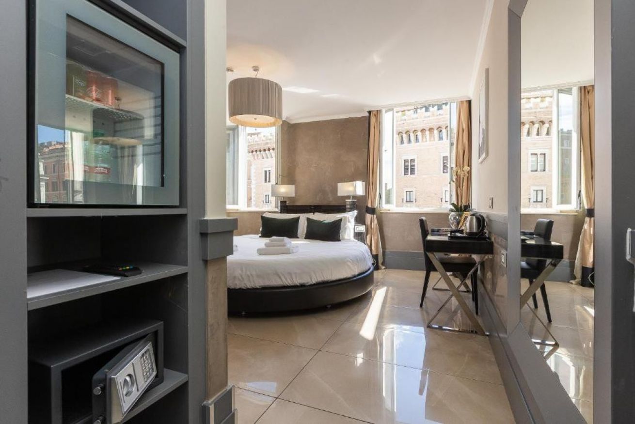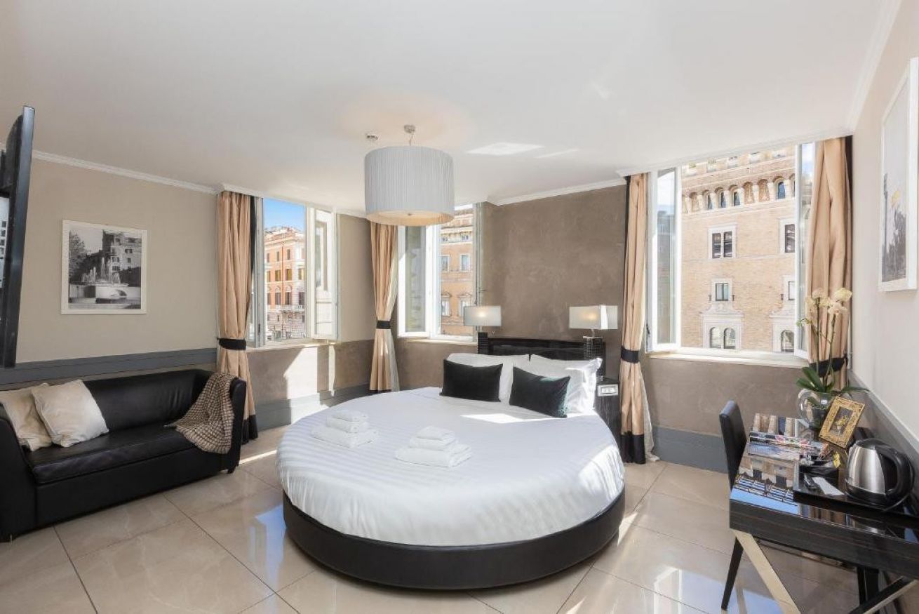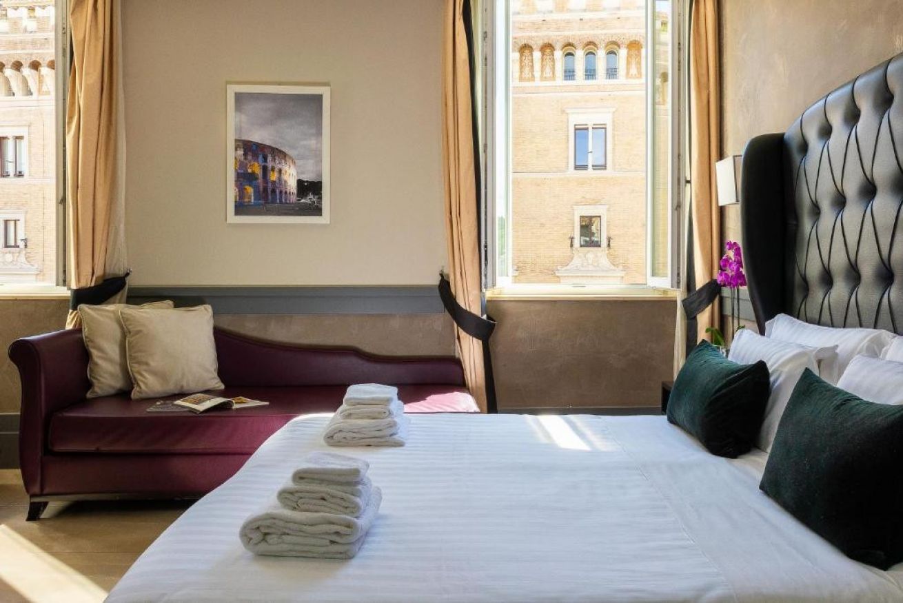 Camera matrimoniale con divano letto adatto per tre persone. La camera è ampia 30m2 ed è arredata con un raffinato design classico sui toni del bordeaux e del grigio. Questa si presenta accogliente e luminosa perchè caratterizzata da due ampie finestre con doppio tendaggio e con affaccio verso Piazza Venezia, da pareti chiare e dal pavimento in gres. All'interno si trova un divanetto per alloggiare le proprie valigie e per avere una comoda seduta aggiuntiva; una TV attaccata al muro per avere una comoda visione dal letto; un tavolo, dotato di sedia, dove viene presentato un set per preparare il thè o il caffè direttamente in camera; un armadio a specchio per riporre i propri vestiti all'interno del quale si trova una cassaforte digitale e un minibar. La camera è dotata di un bagno con WC, bidet e doccia a vetro, inoltre viene fornito un vanityset, dello shampoo e bagnodoccia a camera.